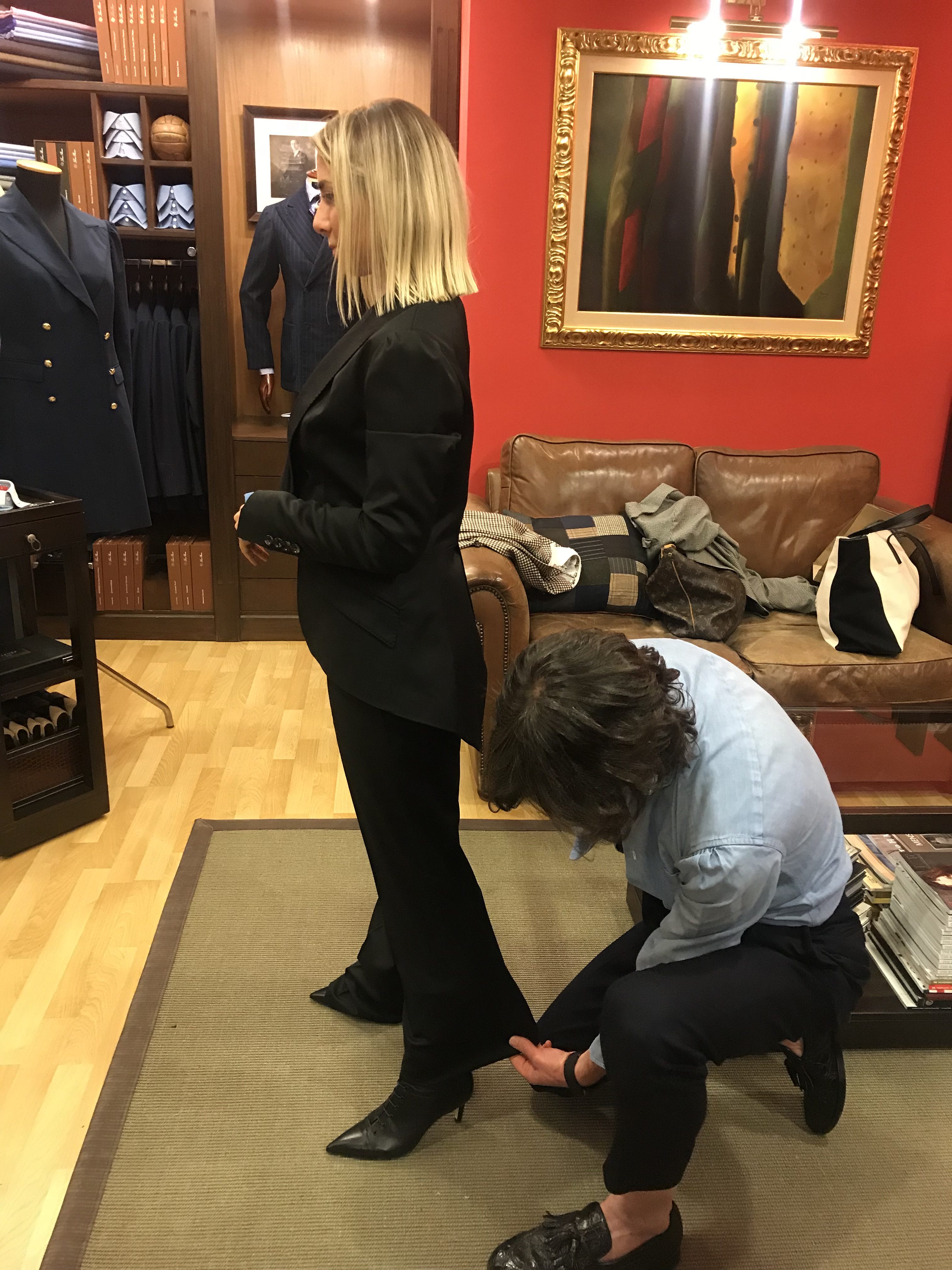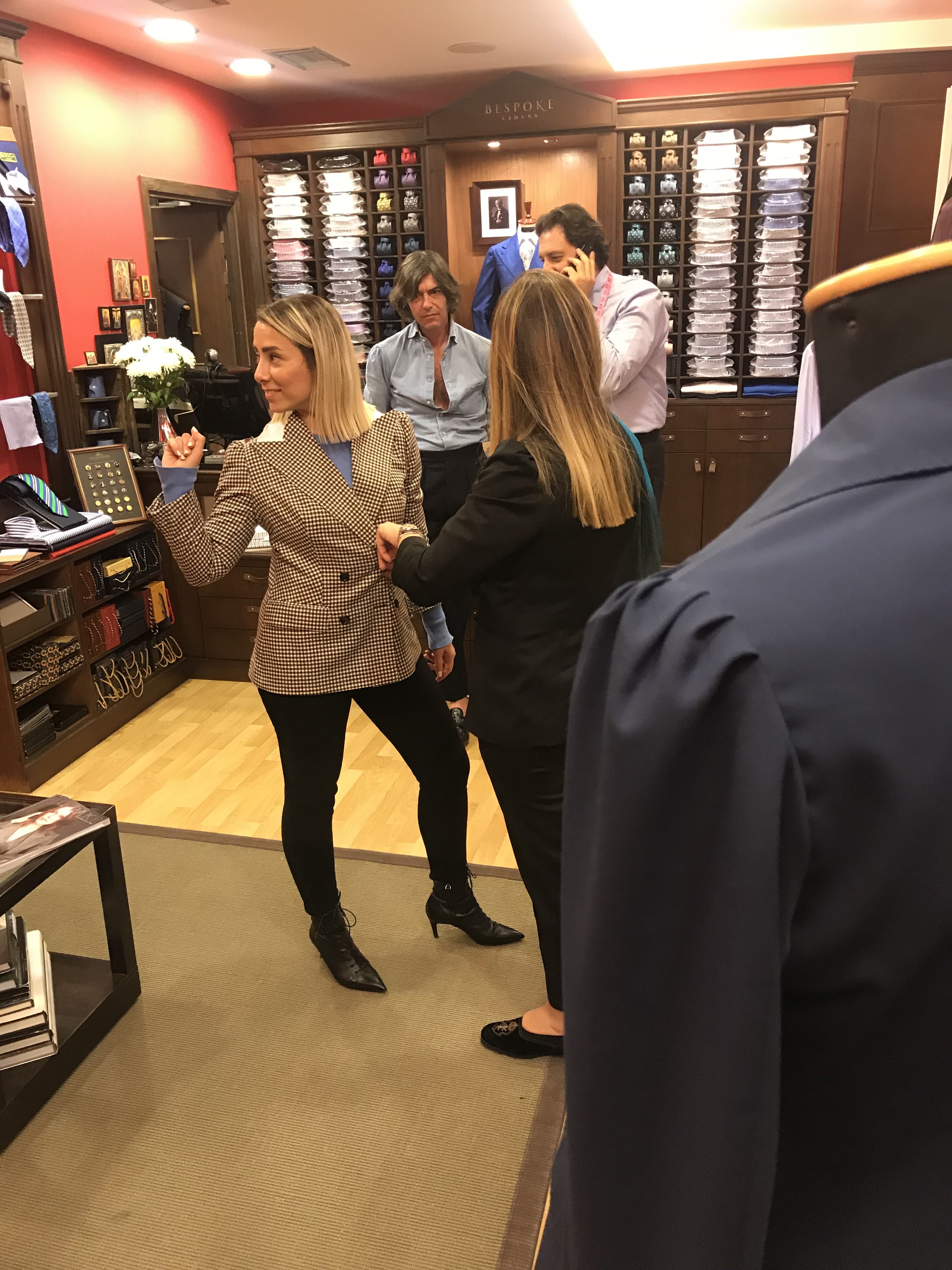 Among others we discovered the luxury coat with silk fabric of Holland & Sherry, the Baby doll model without canvas, without lining, the Checked double breasted cotton and linen, the Cashmere and wool Harrison fabric, were just a few Lady’s masterpieces we had the chance to try on from her first sneak preview collection at bespoke Athens trunk show.